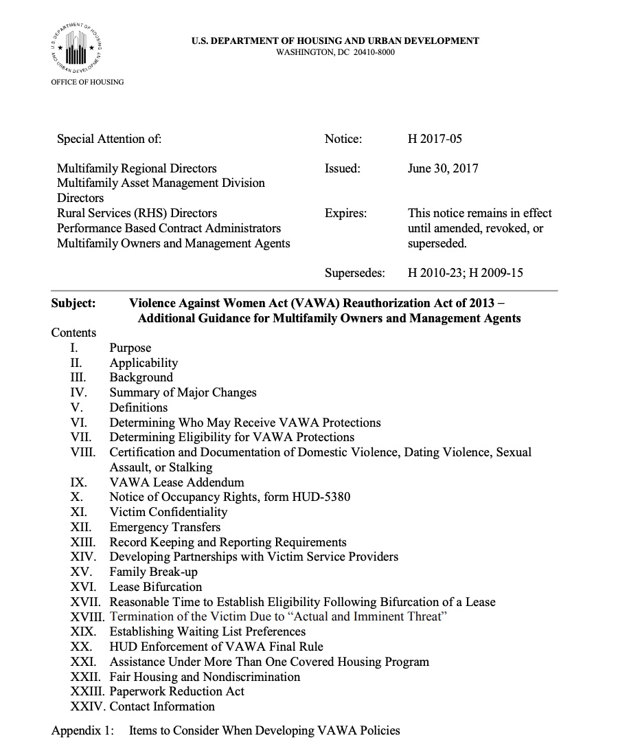 This notice provides guidance to owners and management agents (O/As) of HUD multifamily assisted housing on the requirements of the Violence Against Women Reauthorization Act of 2013: Implementation in HUD Housing Programs, Final Rule, published in the Federal Register on November 16, 2016, (81 Fed. Reg. 80724 (November 16, 2016)) (VAWA Final Rule). This notice does not encompass every aspect of the VAWA Final Rule and should be used in conjunction with the VAWA Final Rule.