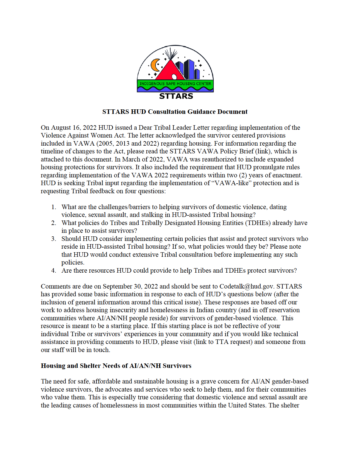 On August 16, 2022, HUD issued a Dear Tribal Leader Letter regarding implementation of the Violence Against Women Act. The letter acknowledged the survivor-centered provisions included in VAWA (2005, 2013, and 2022) regarding housing. For information regarding the timeline of changes to the Act, please read the STTARS VAWA Policy Brief (link), which is attached to this document. In March of 2022, VAWA was reauthorized to include expanded housing protections for survivors. It also included the requirement that HUD promulgates rules regarding the implementation of the VAWA 2022 requirements within two (2) years of enactment.